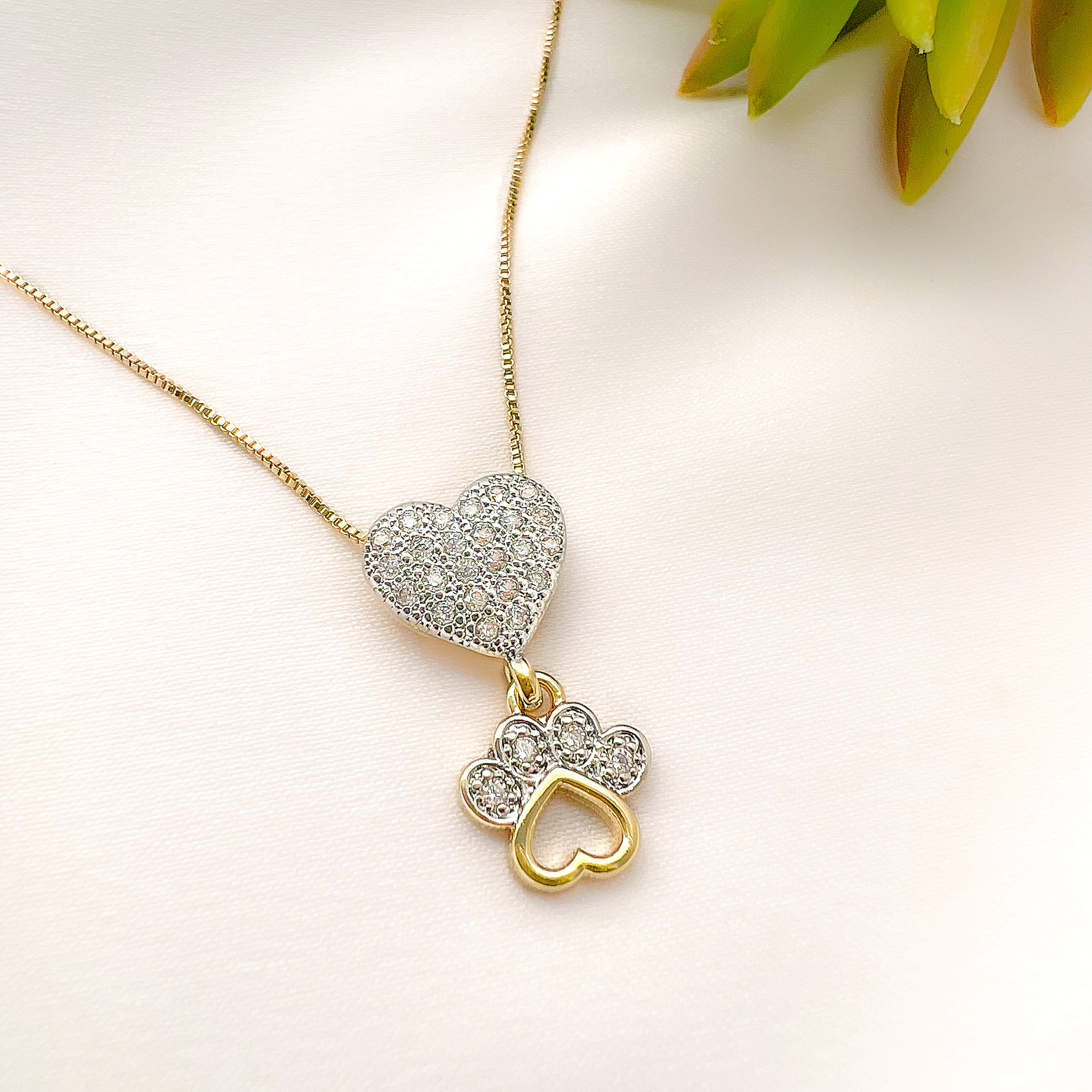 Timeless, elegant, and full of meaning, the Pavé Heart Necklace with Paw Charm is a luxurious piece designed for pet lovers who appreciate refined design with a sentimental touch. Featuring a heart pendant fully set with sparkling clear zirconia stones, this necklace also includes a delicate paw charm, accented with crystal details on the toes and a subtle heart shape on the paw pad.